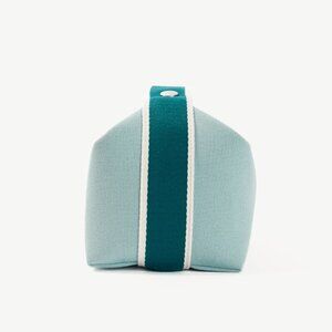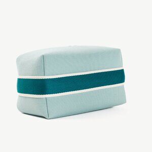 Made in France, this small Bride-a-Brac case from Hermes is crafted with a sturdy canvas in a light Eucalyptus blue, and features silver-tone hardware, a teal polycotton strap with snap closures and white edges, an embroidered "H" motif on the front, a top zip closure with a leather pull, and a herringbone canvas-lined interior containing three slip pockets.