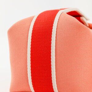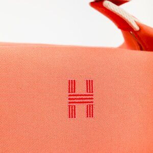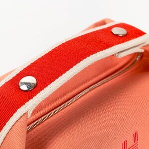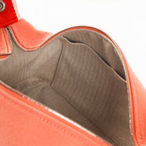 Made in France, this small Bride-a-Brac case from Hermes is crafted with a sturdy canvas in a Goyave coral, and features silver-tone hardware, a red polycotton strap with snap closures and white edges, an embroidered "H" motif on the front, a top zip closure with a leather pull, and a herringbone canvas-lined interior containing three slip pockets.