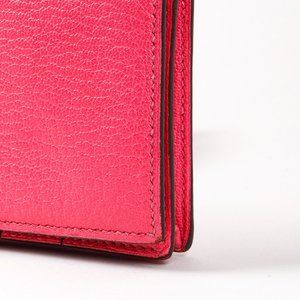 This wallet is done in Fuchsia Chevre Myzore Leather, featuring Palladium Hardware, and a belt closure. The interior features five card slip pockets, four long slip pockets, and a zip pocket.