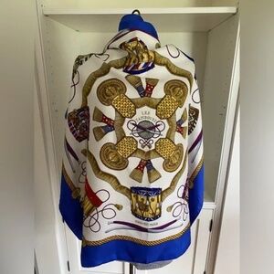 Hermes Les Tambours Silk Scarf in vibrant jewel tones, blues, reds and gold on a field of white. Vintage piece in excellent condition. No snags or stains. Tag is in lovely condition, plump rolled hem. Comes with Hermes box and ribbon. Please note the box shows signs of wear.