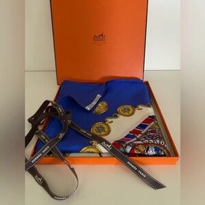 Les Tambours (the drums) designed by Joachim Metz, was first issued in 1989 and depicts drums used by the battalion drummers, who were part of the Imperial Guard under Napoleon III in the mid 18th century. At the centre of the carré are the Imperial Guard uniform epaulettes. Research suggests that the drum above Hermès – Paris is taken from an etching from the personal collection of Émile Hermès. – copyright – signed – care tag intact – vibrant colours – hand rolled hem – made in France – 100 % pure silk – approx. dimensions: 36 x 36 inches ( 90 x 90 cm) – *Hermès box shows signs of use