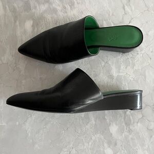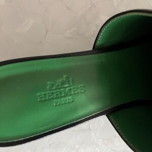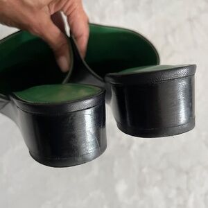 Black Hermes’ mules in size 39. Beautiful green interior. Lightly worn (just a few times) so some slight creasing in leather as shown in pictures. Heel height is 1.5” high.