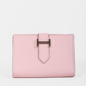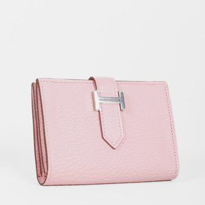 The gorgeous and sleek Bearn card holder from Hermes in stunning soft cherry blossom pink grained leather features a palladium-plated ‘H’ closure with a leather tab and opens to a matching leather interior with four card compartments.