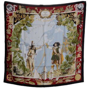Designed by Kermit Oliver, the only American to design for Hermes, the Le Canada scarf featuring Samuel De Champlain (silk, 2006) can be both worn or framed and displayed.