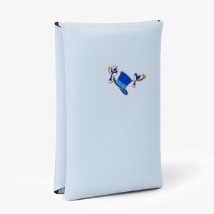 Inspired by Jonathan Burton’s deck of cards, the Hermes Calvi card holder is crafted from Swift leather in “Bleu Brume” with a unique horse print. This card holder features leather lining, two spacious card slots, and a palladium-plated snap closure.