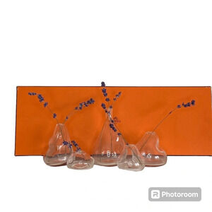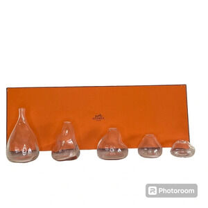 Hermes gorgeous blown glass mini vases. Each one is etched with Hermes brand on the bottom and each one is unique to its partner.