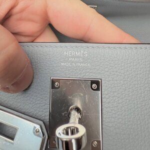 Hermès 2025 Gris Pantin Togo Kelly Retourne 28 PHW Bag. Retourne trapezoid-shaped silhouette. Gris Pantin (cold grey) Togo leather with fine grain texture. Features palladium-plated hardware, clochette with lock and keys, protective feet, and matching detachable shoulder strap. Hermès engraving on all hardware elements. Top handle. Hermès’ signature turn-lock closure. Lined in chèvre leather with a zip pocket and a slip pocket. K stamp - 2025. Comes complete with original Hermès orange box, felt protector, dustbags, ribbon, brand cards, and purchase receipt. Made in France.