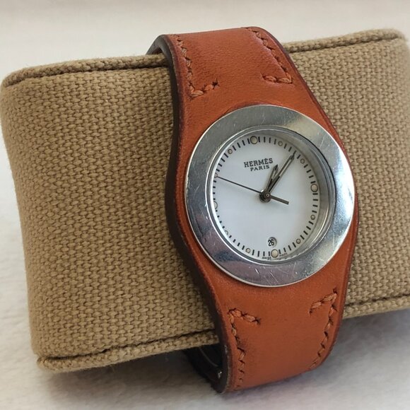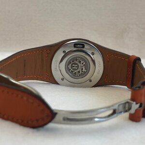 The Hermes Arne HA3.210 is a women's wristwatch featuring a white dial and a stainless steel case. The watch is complemented by a brown leather band, suitable for wrist sizes ranging from 13cm to 16cm (5.11'' to 6.29''). With a case diameter of 27mm (1.06'') and a thickness of 9mm (0.35''), it offers a compact design. This quartz movement watch includes a date function and is water-resistant up to 30 meters (98.42ft).