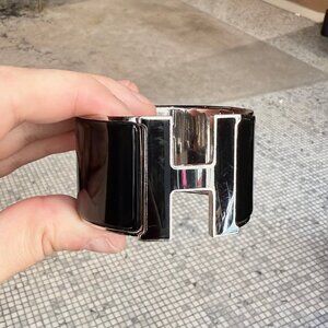 Extra wide hinged cuff design. Signature Hermès rotating “H” clasp at center in black enamel. Matching black enamel with palladium plated metal hardware. Made in France. Comes as is.