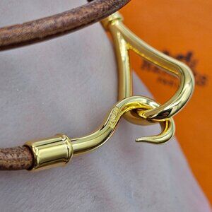 Crafted from premium brown leather, it features a luxurious gold-tone hook clasp, embodying timeless elegance and refined design.