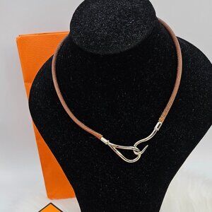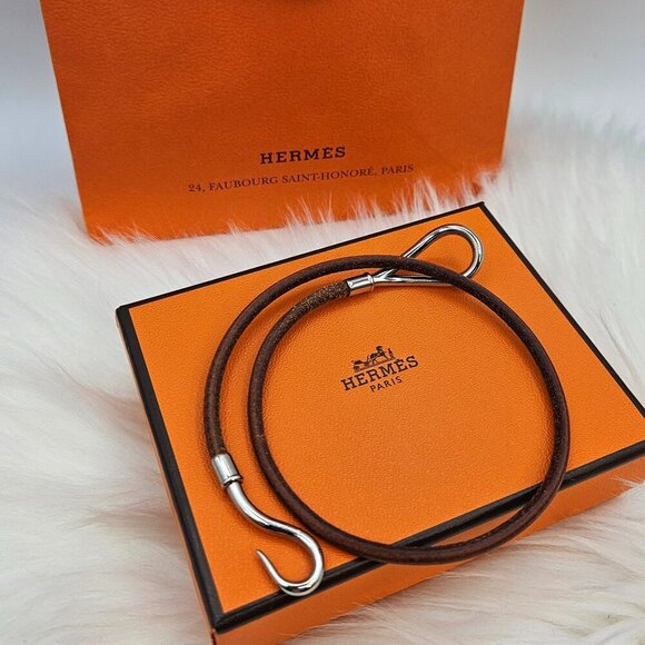 Hermès Brown Leather Silver-Tone Hook Bracelet