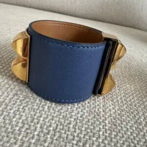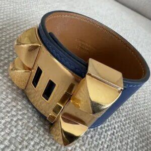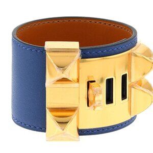 Hermès Blue Leather Collier de Chien Bracelet. Turn-lock closure. GOLD-toned hardware. Tonal stitching.