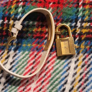 Hermes Yellow Gold Metal and Leather Kelly Quartz Watch Plated 20 with dial color yellow gold, band color white, band material leather, case material plated 18k yellow gold, movement quartz "Case Size/Width: 20mm Watch Height: 9mm Band Width: 13mm Wrist circumference: 6.0" / 0.35"h x 0.51"w Inches