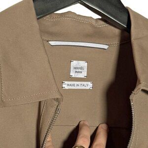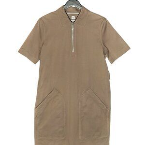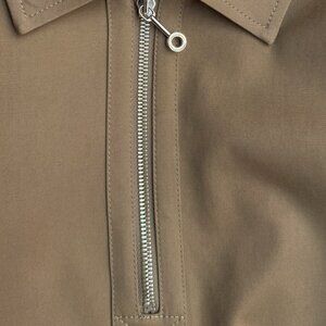 Structured utilitarian fit. Smooth cotton blend. Short polo collar. Silver-tone half zip closure at the front. Self-tie belt at the waist. Large front patch pockets. Short sleeves. Straight hem. Made in Italy.