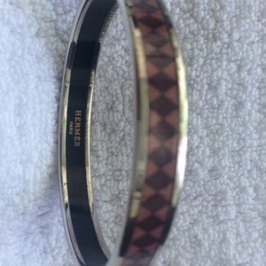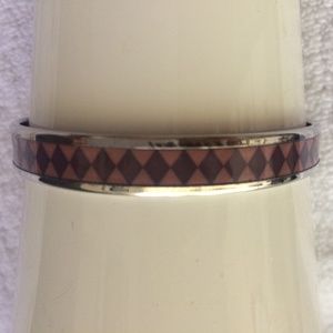 Dusty rose with maroon diamond pattern. Silver banded, some scuffing on band edges. Hermès size 65mm. Inner diameter 6cm (2.36in), outer diameter 6.5cm (2.56in), 0.9cm wide.