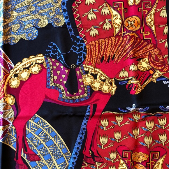 - hand rolled silk scarf with intricate detail and gorgeous rich colours evoking the steppes of central Asia and the Silk Road