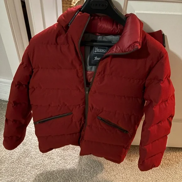 Stylish and warm puffer jacket. Features a rich cherry hue. Perfect for chilly days.