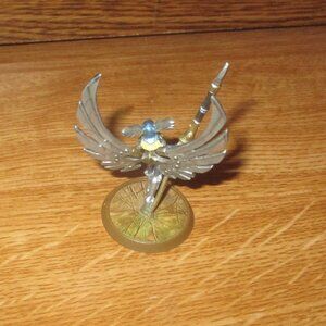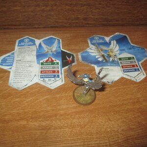 This is the figure / miniature Raelin the Kyrie Warrior from the Heroscape board game from Hasbro that is in pretty good shape with it's card and a bonus card from another figure that are in decent shape with some wear mostly on their edges and some bends in it. They are being sold as is (for people needing it for their game or for role playing games