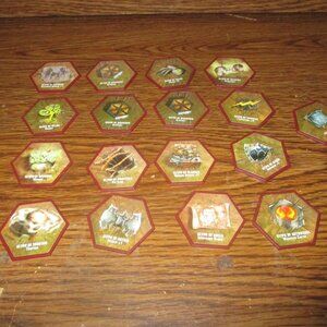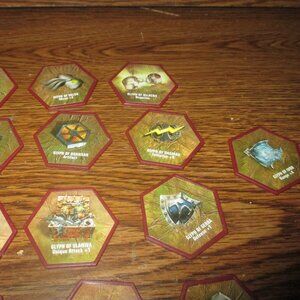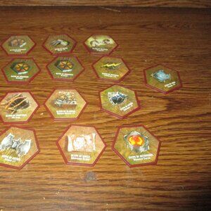 This is a set of Heroscape 17 Glyphs (most of them except 3 are unique). They are all in pretty good condition as shown and are all from the Heroscape board game from Hasbro. They are being sold as is (for people needing it for their game or for role playing games. They can be combined in shipping with other items.