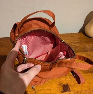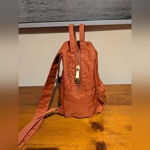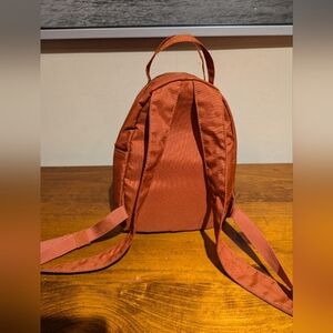 Mini backpack by Herschel. Burnt orange colour. In good used condition with very minor wear on bottom (see close up pic). Metal zippers and straps work great.