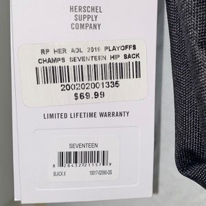 Herschel Supply Co “Seventeen” Hip Pack. Features Raptors 2019 NBA Champs Logo -Signature striped liner -Zippered main compartment -Adjustable clip-fastened strap -Front pocket with waterproof zipper and key clip -Gender Neutral