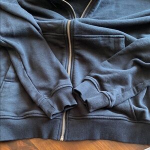 Charcoal hoodie with front zipper. Features drawstring hood and logo detail.