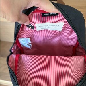 Sleek Herschel backpack in black and tan. Ideal for daily adventures. Features durable design and practical pockets.