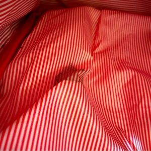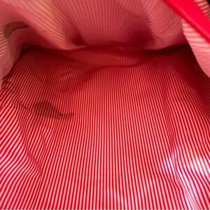 This backpack is pre-owned and in used condition. There are a few large stains inside of the bag, on the inner side of it and on the back and front of the inner lining as well. There are a few small marks on the red part of the outside of the bag and some scuffs and marks on the bottom of the bag. Please see all photos for exact item.