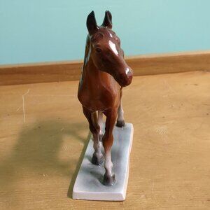 From my mother's horse figurine collection. Hertwig Thoroughbred Horse figurine # 1467. Bought at Birks, excellent undamaged condition. This wonderful porcelain figure is of a sorrel or copper-red chestnut horse with dark mane and tail with a white design on it's forehead and white stockings. The figure measures 17" in length, 15" in height and stands on a slightly raised base. It is stamped in green with the company logo and "Hertwig". This marking was used from 1941-1958, before the company was nationalized.