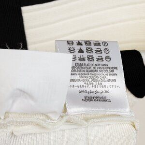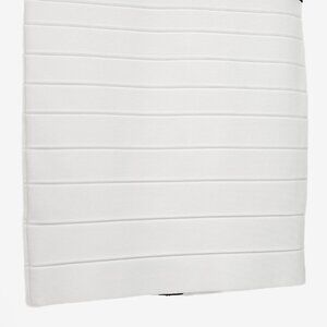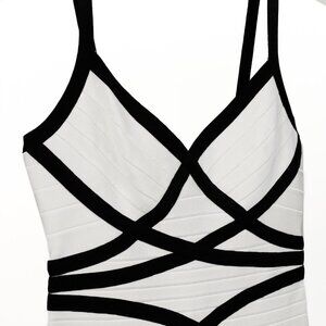 This beautiful black and white dress from Herve Leger features black piping in an X pattern along the bust and waist, V-neckline, sleeveless with shoulder straps, and a hook-and-eye and zip back closure.