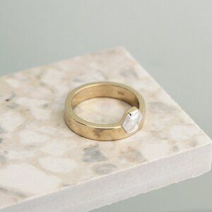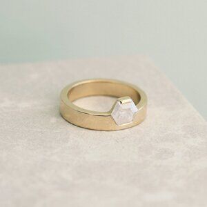 This contemporary engagement ring features a one-of-a-kind rose cut hexagon diamond that's conflict-free, set in solid 14k gold.