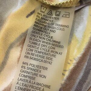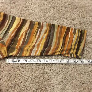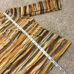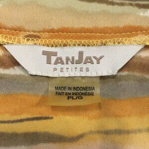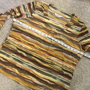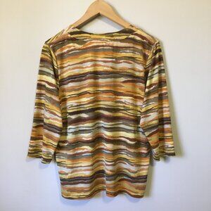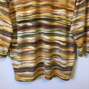 Very good preowned vintage condition, 3/4 sleeve, pleated collar, stretchy top by TanJay featuring a cool planetary/Jovian pattern in an assortment of warm tones: yellow, tan, brown, orange and cream. Collar is rounded and banded and there is pleating at the center.