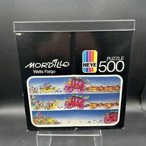 The item in the image is a vintage 500-piece jigsaw puzzle titled "Wells Fargo" by Mordillo, produced by Heye in 1986.