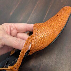 Heyraud rust-brown slingback sandals in woven leather. With adjustable slingback strap. Slightly squared toe. Ideal for both casual and dressy occasions. Crafted with high end details. Gorgeous. Excellent condition. Crafted in Italy. French design. Fits an A or B width. Size 36 fits US size 5.5 or 6. Not quite as bright as the colour in the photos; more rusty brown (not orange).