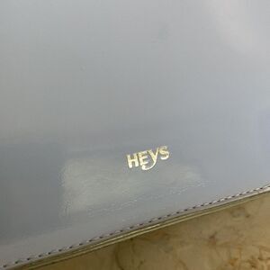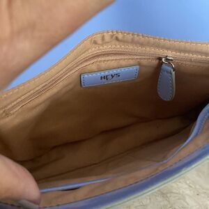 In very good preowned condition lovely Heys mini messenger style shoulder bag in pastel blue. Has adjustable shoulder strap, front flap has two magnetic snaps, one large slip pocket under flap, main compartment is cloth lined and clean with a zippered compartment and two slide in pockets.
