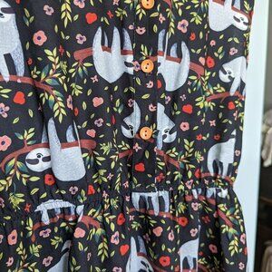 This adorable sleeveless dress is perfect for spring and summer. Features an all over sloth print, sleeveless button front top, and elasticized waist. It's light, breezy and perfect with a belt and a jean jacket. In excellent used condition there are no noted rips, stains, holes or areas of excess wear.
