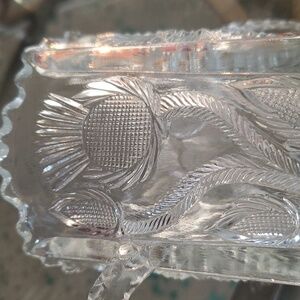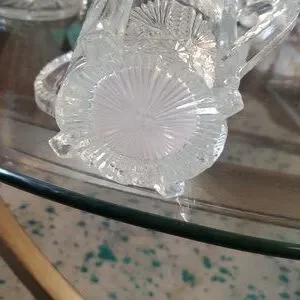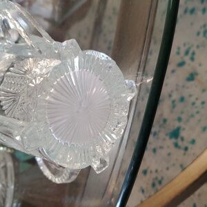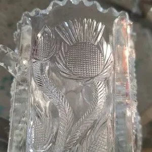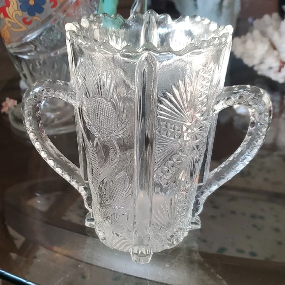 Beautiful clear glass vase with intricate patterns and dual handles. Perfect for home decor. used for spoon or celery