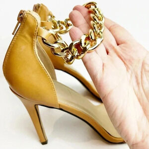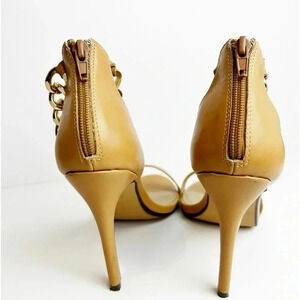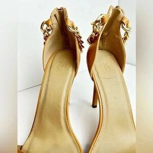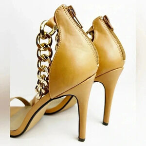 High 4” heel open toe shoe, Size 9, gold chain accents, tan Size 9, Elegant Sexy