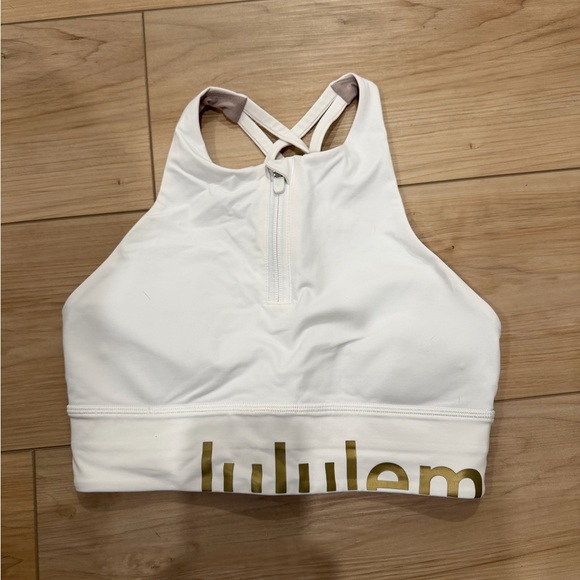 High-neck energy sports bra with front zipper. Features gold logo detail. Excellent condition, just don’t wear it enough!