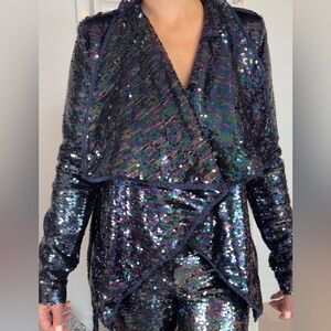 Elevate your style with this dazzling sequin suit in size Medium. This stunning set includes a shimmering blazer and matching pants, perfect for making a bold statement at any event.
