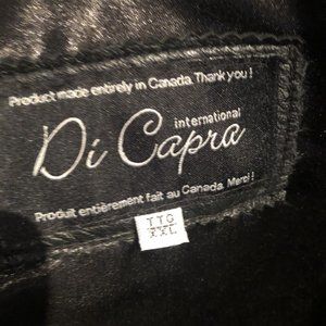 A beautiful New High End Soft Italian Lamb Leather Hip Length by Di Capra. The hood has genuine fox trim and is detachable. The measurements are as follows : Shoulder span .. 19" Collar to cuff 31" Shoulder to cuff 25" Bust 50" Length 33"