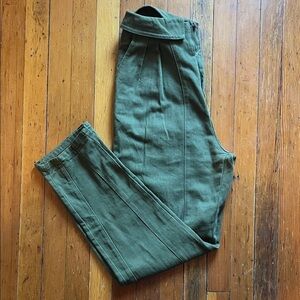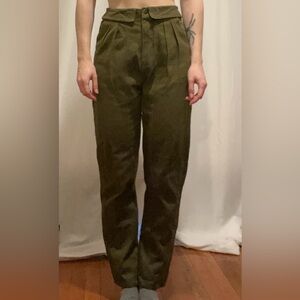 Retro chic high waisted pants with tapered legs and pleated front. Waist features a unique folded over detail that adds some intrigue and class. 100% cotton makes these pants comfortable and breathable like a great pair of jeans!
