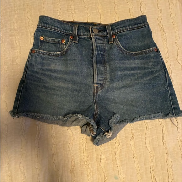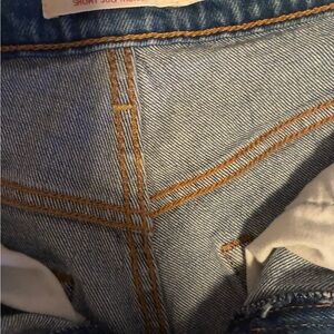 Vintage-inspired ribcage shorts in size 27. Featuring a flattering high-rise fit that cinches the waist and gives that classic, structured denim look. Medium wash with contrast stitching and sturdy, quality denim construction.