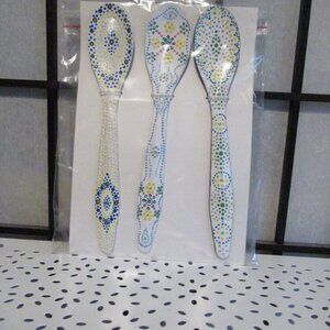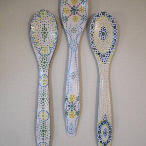 Each spoon measures 7.25″H x 1.25″W, Aspen Wood, Acrylic paint w/ acrylic high gloss glaze.