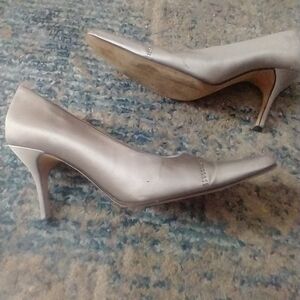 Vintage pumps 3.5 in heel, soft silver with Austrian crystals across toe. Size 8 b .Silver satin , lined, leather sole
