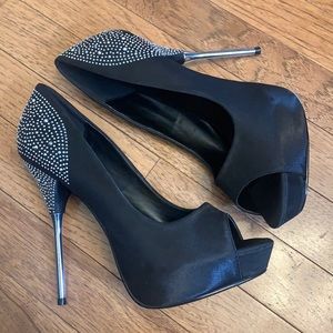 Forever 21 heels. These heels have a one inch platform toe and a five inch heel. They are beaded on the heel. Super comfortable fit.