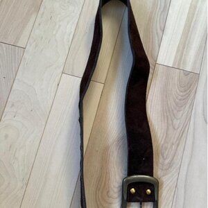 High quality chocolate brown suede belt with a wide band and a solid brass-toned buckle. Soft suede texture with smooth leather backing. A durable, timeless accessory that elevates both casual and dress looks.