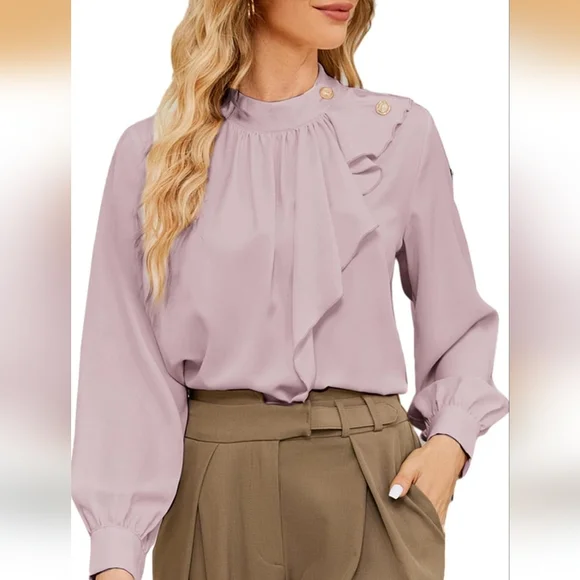 Soft, flowing blouse with a high ruffle neckline and decorative shoulder buttons. Lightweight fabric for comfortable all-day wear. Long puff sleeves with elastic cuffs create a polished silhouette. Dusty mauve color adds a subtle, feminine touch.
