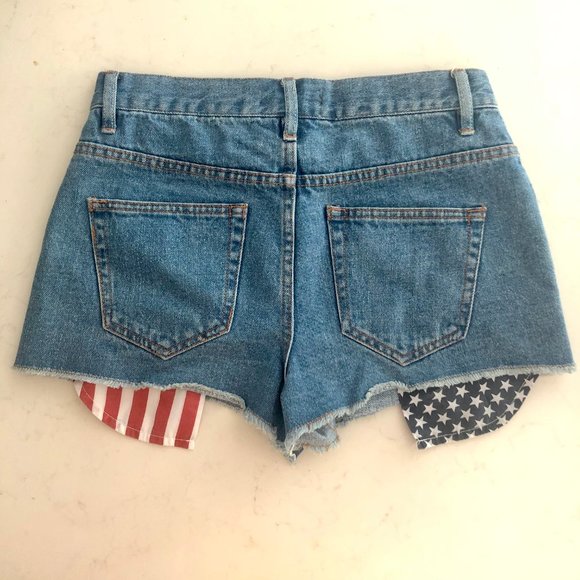 Cute high rise shorts with distressed pockets. American flag pattern peeps out from the pockets.
