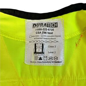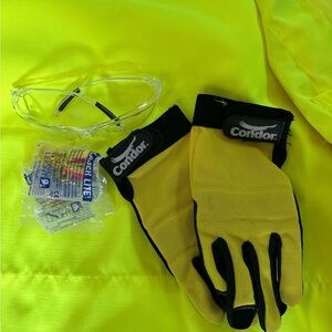Bright yellow safety vest with orange and silver reflective stripes. Ideal for construction or road work. Comes with safety, glasses, gloves, and ear protection. Never used.